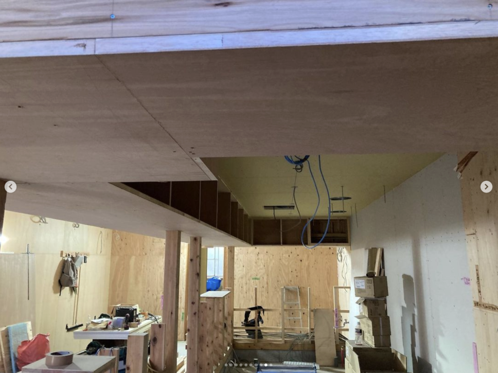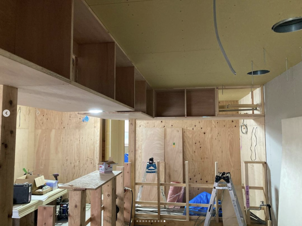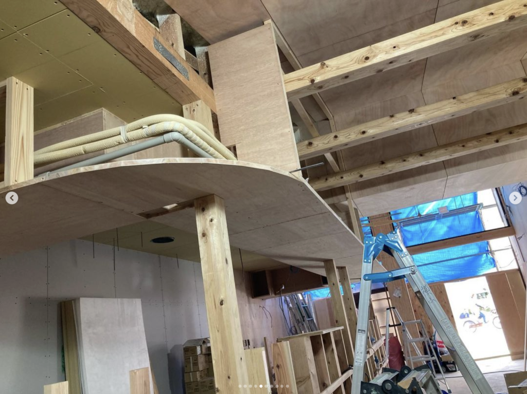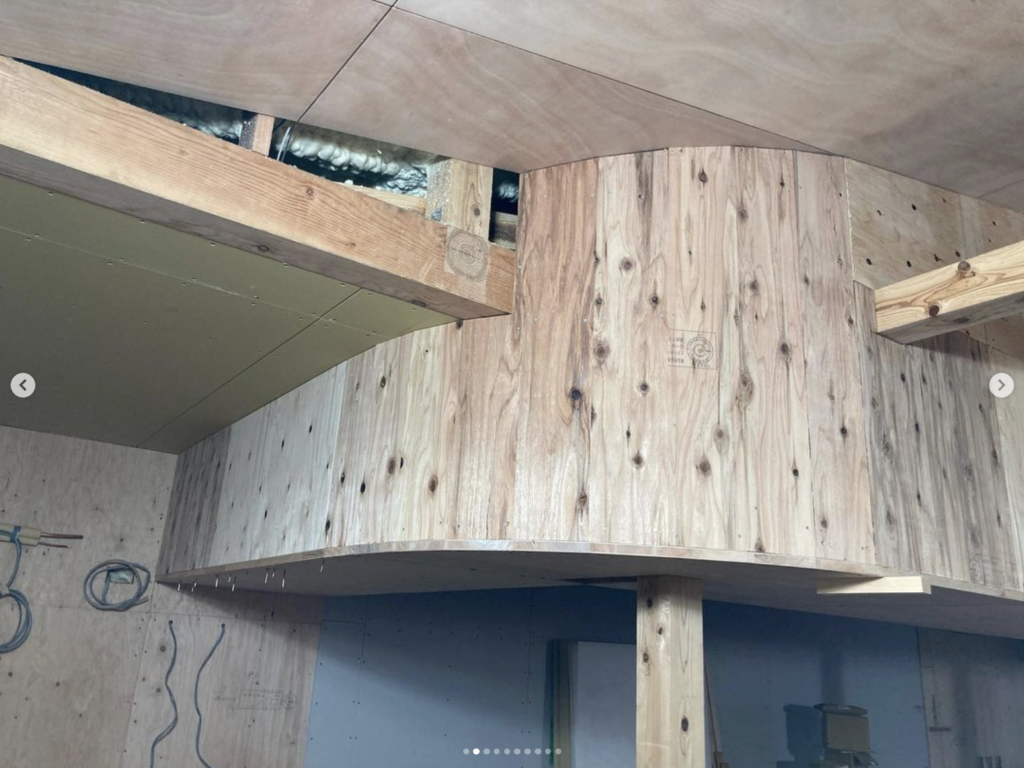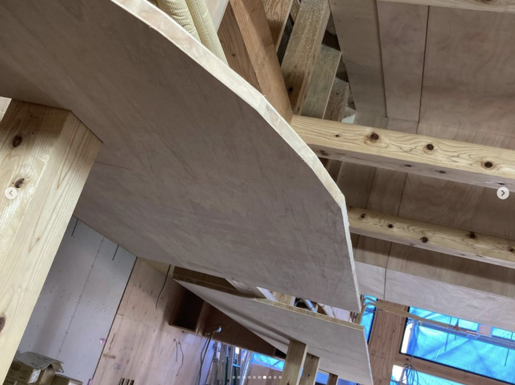 最初にキッチン内部の造作棚を取り付けてから、棚の底板をそのままR下地の型板にしてそれを勾配天井まで上げていく方法にしました。